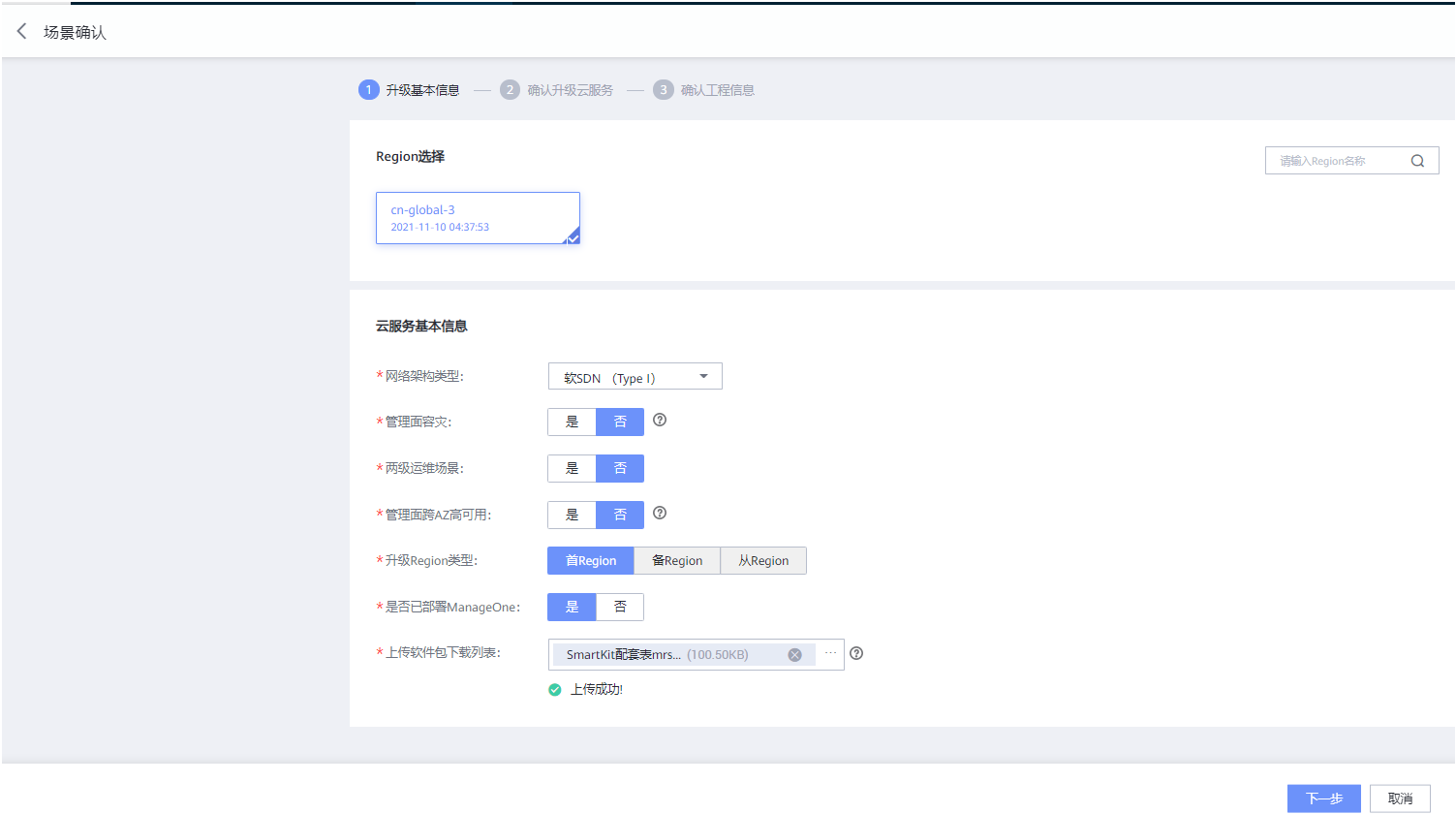 在“升级基本信息”页面,选择需要升级的region,确认云服务基本信息,然后上传软件包下载列表,上传成功后点击下一步;