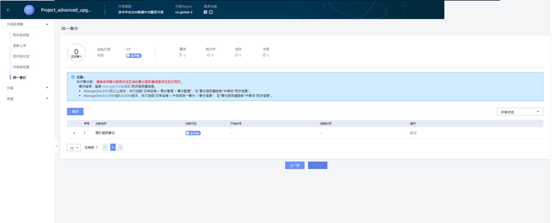 在“统一备份”页面,等待备份任务生成后,点击"执行",备份当前数据;备份完成后点击“下一步”;
