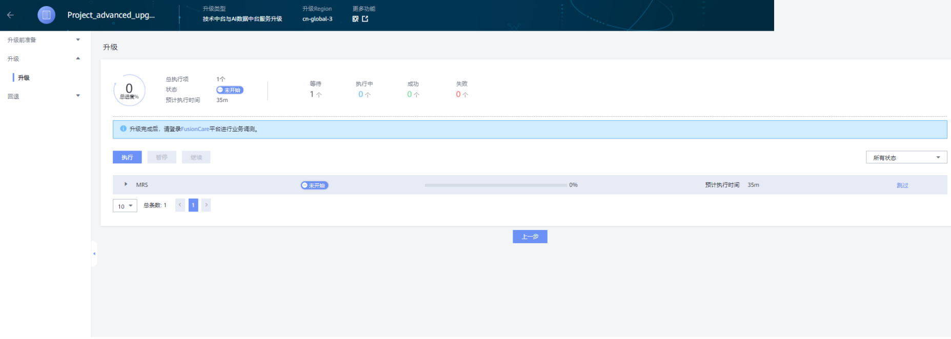 在“升级”页面,点击“执行”进行升级,等待升级执行完成。