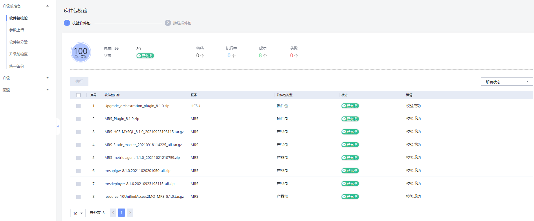 在“升级前检查”页面,HCSU框架会查询当前环境并生成一条升级前检查任务,等待生成后点击“执行”进行检查,其中检查异常项要进行分析,否则将会影响升级流程。全部成功或处理完成后点击下一步。