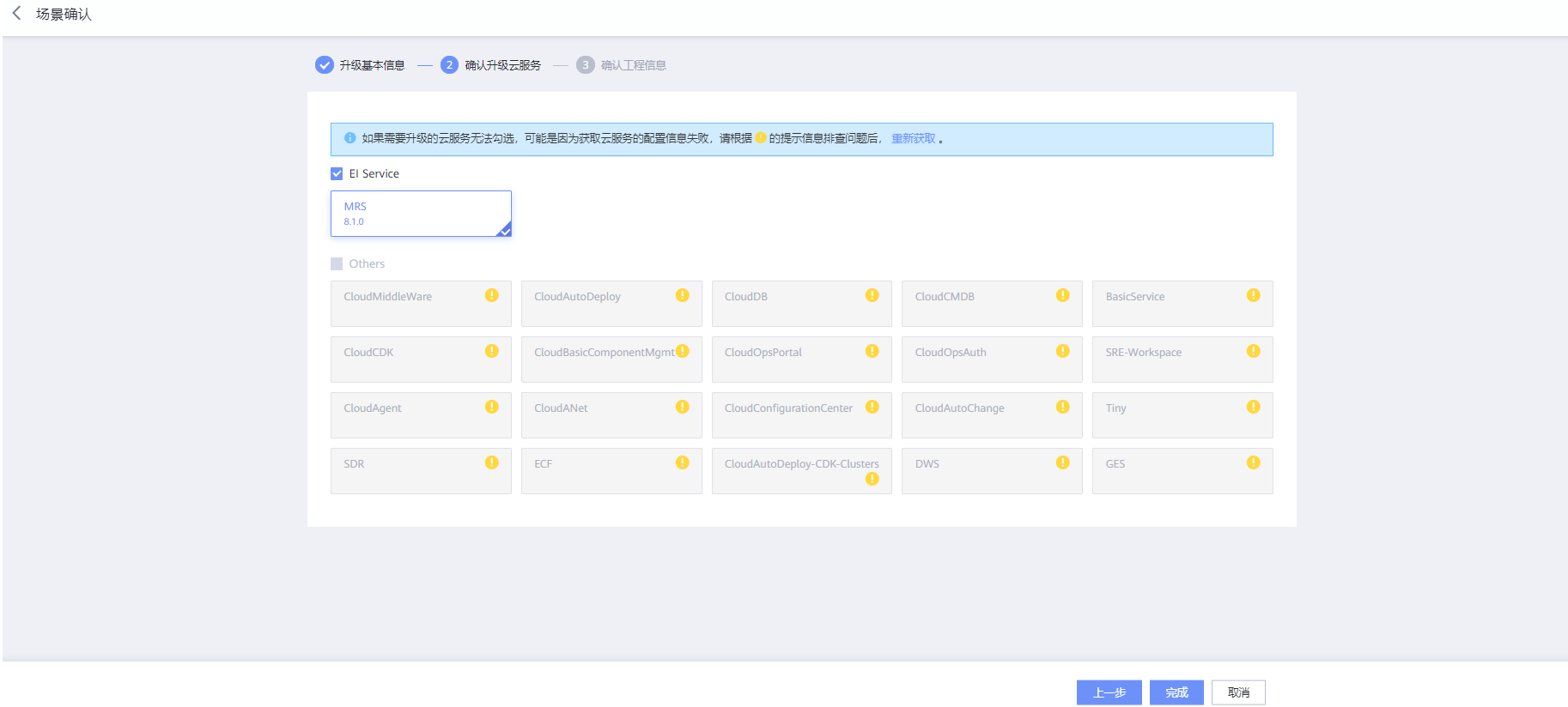 在“确认升级云服务”页面,确认是否MRS是自动勾选状态,升级框架会解析软件包下载列表确认需要升级的服务;