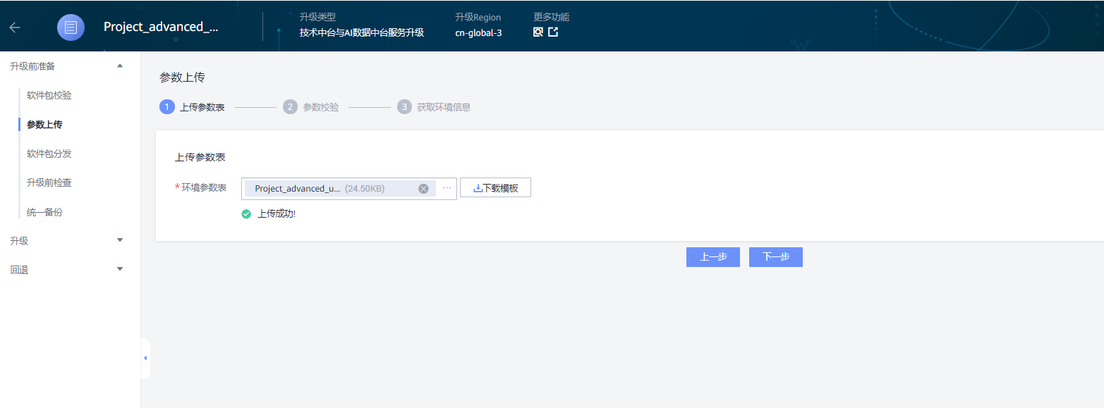 在“上传参数表”页面,点击“下载模板”下载参数模板,并按照参数描述等信息填写完成后保存,在HCSU页面上上传参数模板,等待上传完成后点击下一步;
