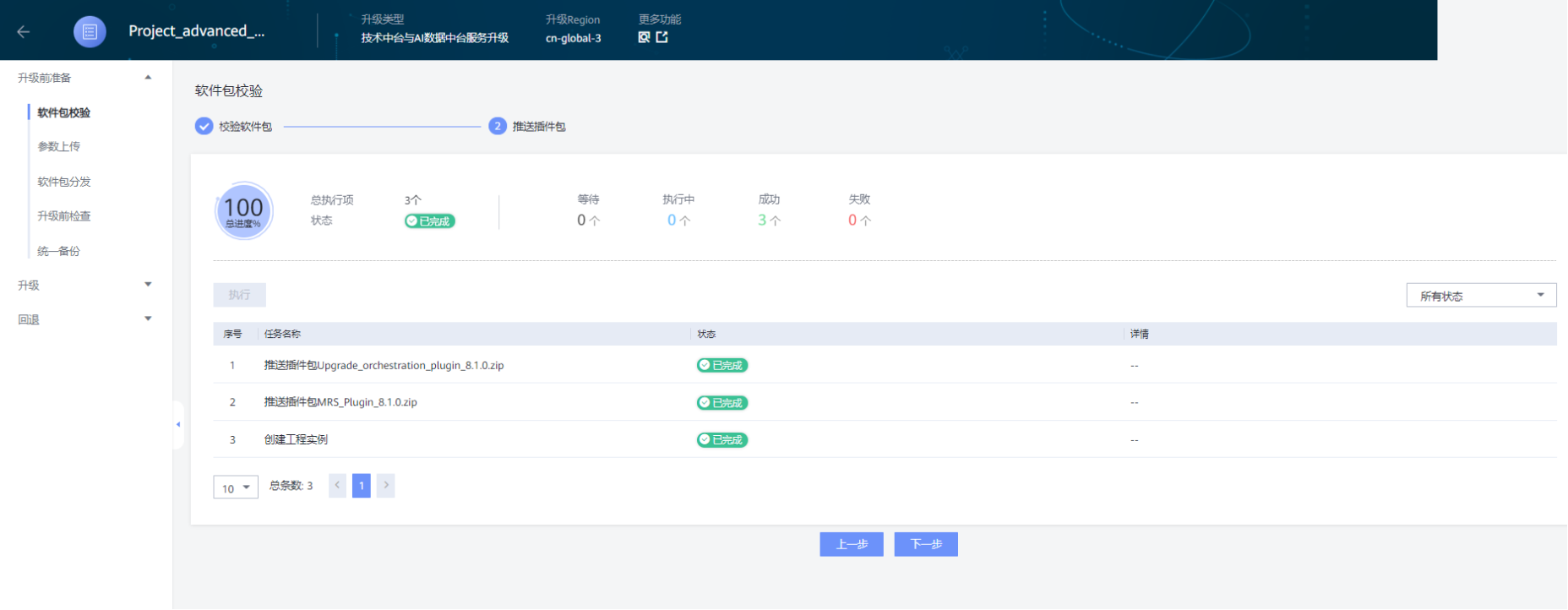 软件包校验完成后,页面会自动跳转至“推送插件包”页面并自动执行,等待推送完成后点击“下一步”。