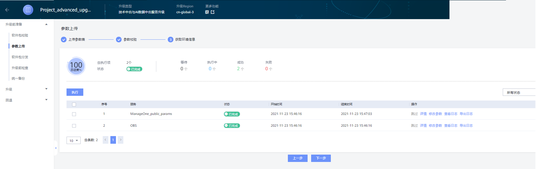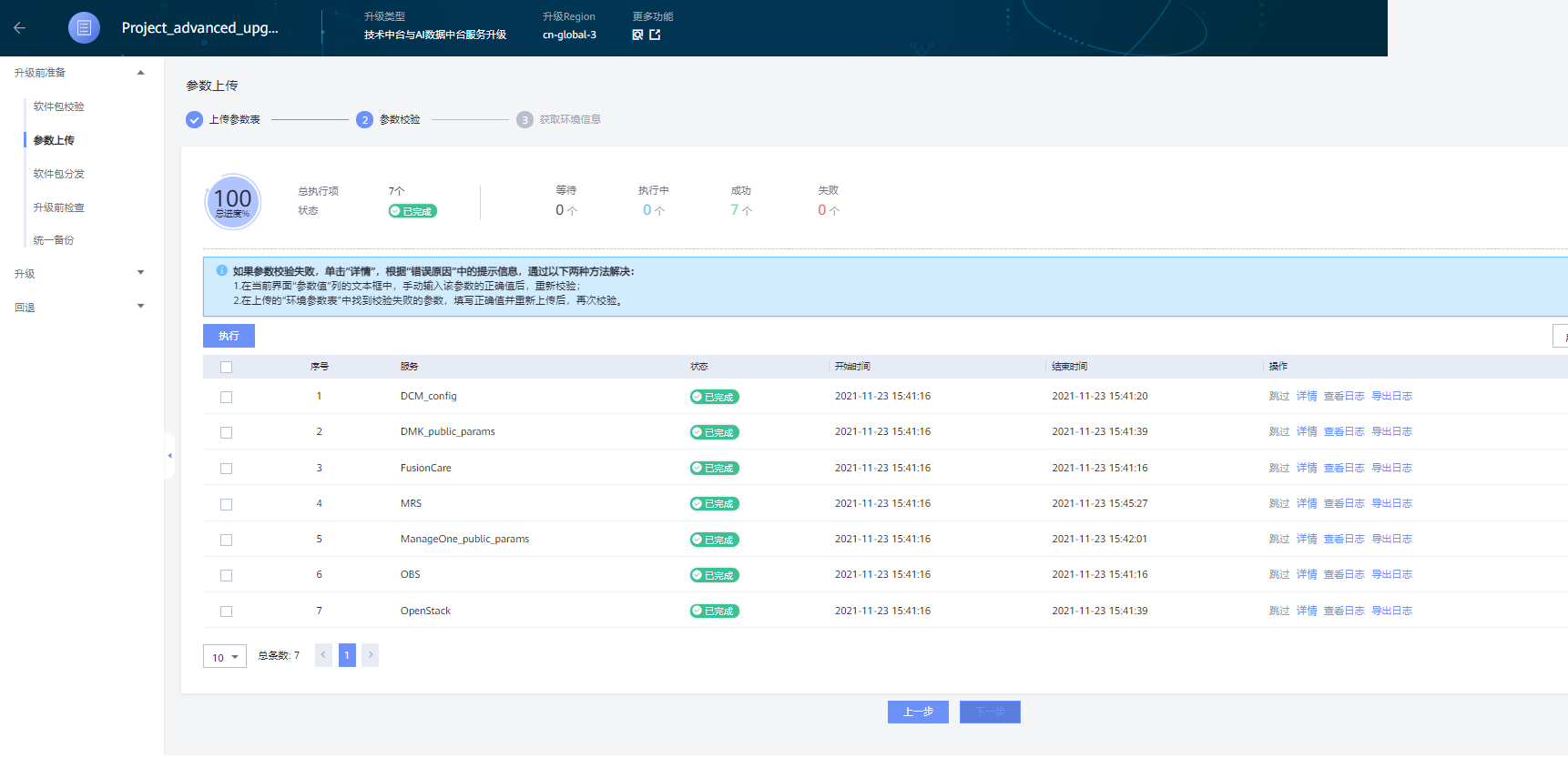 在“参数校验”页面,全选展示的参数并点击“执行”,等待参数校验完成;