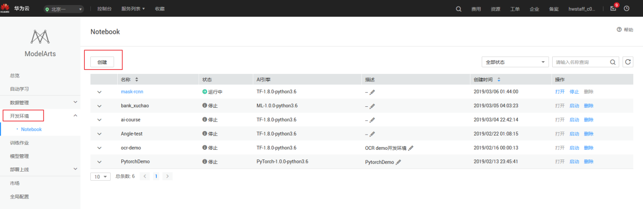 第一步:在ModelArts服务主界面依次点击“开发环境”、“创建”