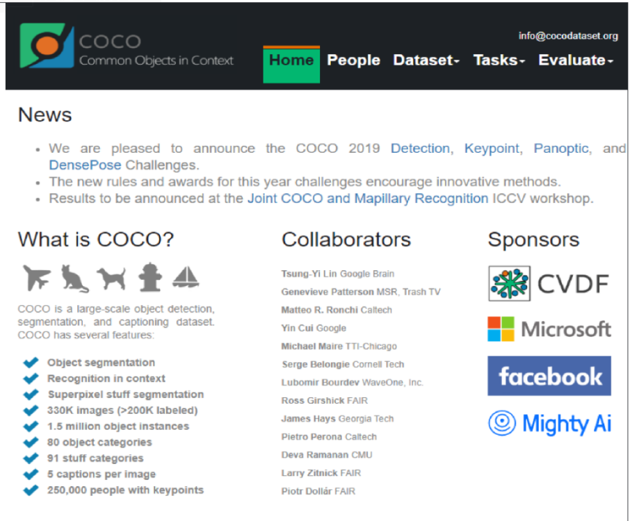 物体分割、对象分割、语义识别、超过330K张图像、80个分类类别、91个物体种类,每张图片提供5种描述,一共250,000个人体关键点标注