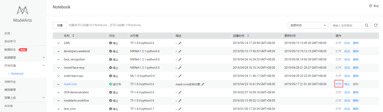第四步:创建完成后,返回开发环境主界面,等待Notebook创建完毕后,打开Notebook,进行下一步操作