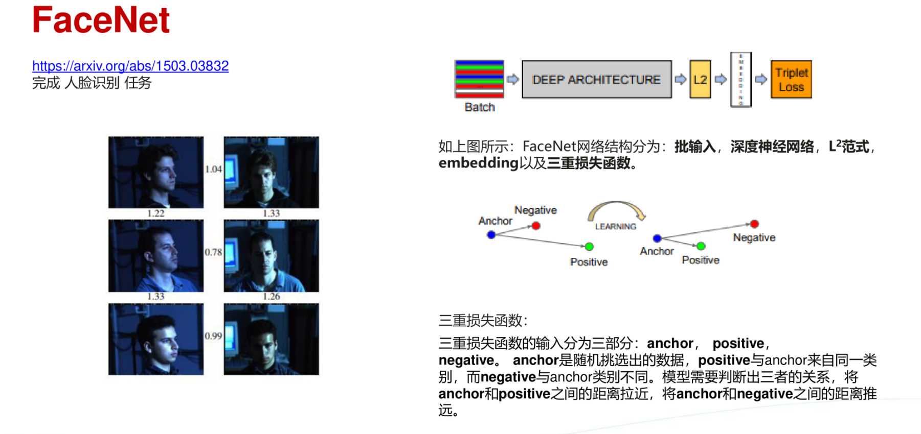 如上图所示: FaceNet网络结构分为︰批输入,深度神经网络,L2范式,embedding以及三重损失函数。