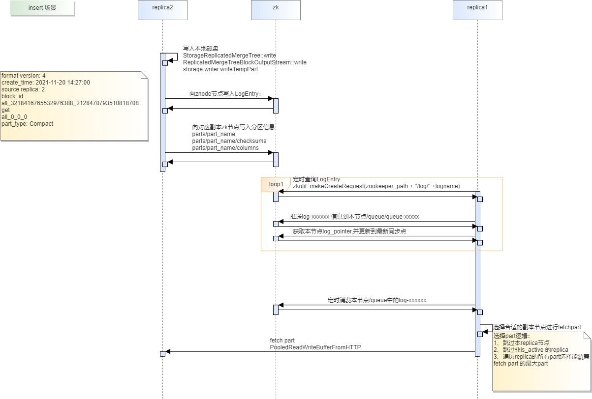 Clickhouse 副本节点之间通过Zookeeper 的log数据和其他控制信息,实现了副本间数据的异步同步。本文中简单介绍插入数据后副本之间同步流程。