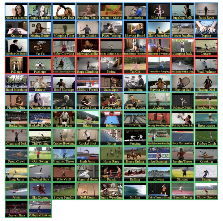 UCF-101的视频类别可以分为25组,每一组包括4-7种视频动作,同组视频有相同的特征,比如相似的背景,相似的视角等等。