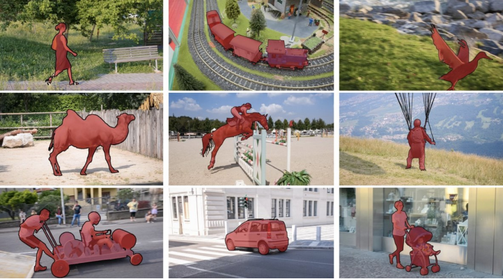 DAVIS全称为Densely Annotated VIdeo Segmentation,也称DAVIS挑战赛,从2016年开始每年举办一次挑战赛,到2019年,已经有半监督视频物体分割、交互式视频物体分割和无监督视频物体分割三个挑战任务。DAVIS官网提供DAVIS 2016和DAVIS 2017两份数据,DAIVS 2016有50个视频序列,DAVIS 2017有90个视频序列,每个视频序列中有几十到上百张图片不等。DAVIS数据集的标注并不是对图片中每个物体都做了标注,而是只对图片中容易捕获人眼注意力的“感兴趣物体”做了标注,如下图所示。