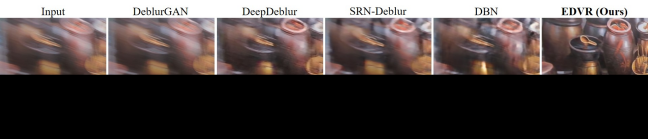 图像的模糊一般是由相机的抖动导致的,这个抖动可以看做加原图上加了一个函数变换,图像去模糊就是找到这个函数反变换,使模糊的图像变得清晰,如上图所示是EDVR (Video Restoration with Enhanced Deformable Convolutional Networks) 算法的去模糊效果,第一列是输入的模糊图像,第2~5列是其他算法的去模糊效果,最后一列是EDVR算法的去模糊效果,可以看到效果是很不错的。