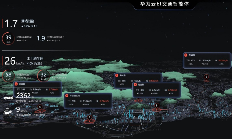 视频结构化是指根据视频画面中呈现出的人、车、物、颜色、数字及其他属性特征,建立视频大数据结构化平台,视频被结构化后,存入相应的结构化数据仓库,不仅使得存储的容量极大降低,还可以进行大数据分析。比如华为联合深圳交警一起做了深圳市主要交通路口的视频车流数据结构化,对路口拍摄的车流视频进行分析,统计车流的信息,从而可以进行大数据分析,对治理交通拥堵、改善交通质量提供了很大的帮助。如下图所示是华为云交通智能体的交通大数据分析示意图,基于这些大数据,可以分析各路口的在途车数、平均车速和拥堵指数。