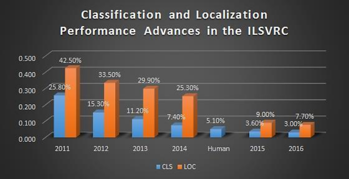 在图像领域中,ImageNet作为一个大型图像识别数据集,自2010年开始,使用此数据集训练出的图像算法层出不穷,深度学习模型经历了从AlexNet到VGG-16再到更加复杂的结构,模型的表现也越来越好。在识别千种类别的图片时,错误率表现如下: