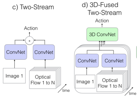 为了捕获图像间的时空关系,论文I3D介绍了三种旧的视频分类模型,并提出了一种更有效的Two-Stream Inflated 3D ConvNets(简称I3D)的模型,下面将逐一简介这四种模型,更多细节信息请查看原论文。