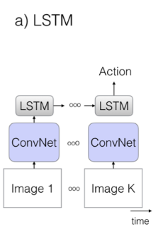 模型使用了训练成熟的图像模型,通过卷积网络,对每一帧图像进行特征提取、池化和预测,最后在模型的末端加一个LSTM层(长短期记忆网络),如下图所示,这样就可以使模型能够考虑时间性结构,将上下文特征联系起来,做出动作判断。这种模型的缺点是只能捕获较大的工作,对小动作的识别效果较差,而且由于视频中的每一帧图像都要经过网络的计算,所以训练时间很长。
