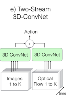 Two-Stream 网络的两个流分别为1张RGB快照和10张计算之后的光流帧画面组成的栈。两个流都通过ImageNet预训练好的图像卷积网络,光流部分可以分为竖直和水平两个通道,所以是普通图片输入的2倍,模型在训练和测试中表现都十分出色。