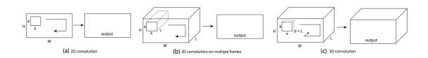 a)中,一张图片进行了2D卷积, b)中,对视频进行2D卷积,将多个帧视作多个通道, c)中,对视频进行3D卷积,将时序信息加入输入信号中。