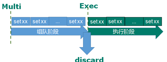 从输入Multi命令开始,输入的命令都会依次进入命令队列中,但不会执行,直到输入Exec后,Redis会将之前的命令队列中的命令依次执行