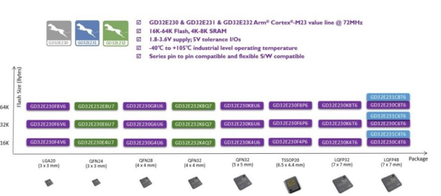 GD32作为中国32位通用MCU领域的主流之选,以累计超过2亿颗的出货数量、超过1万的用户数量、20个系列300余款产品型号选择的广阔应用覆盖率稳居市场前列。GD32使用的是Cortex-M3内核,型号做到了与STM32相同型号的全兼容,方便替换,主频频率更高。