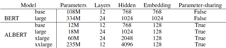 Table 1. 展示了BERT和ALBERT的参数间区别. 可以看到, ALBERT-xlarge的参数量仅约等于BERT-base的60%左右