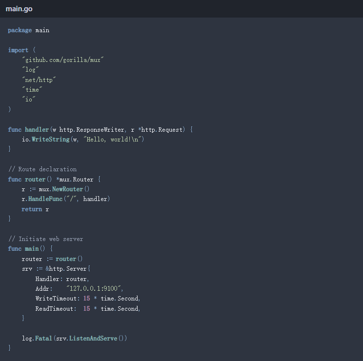 为了通过web服务器提供Go代码,我们将利用非常流行的gorilla/mux模块:一个轻量级的请求路由器和调度器,用于将传入的请求与各自的处理程序进行匹配。https://github.com/gorilla/mux