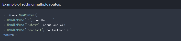 我们通过使用r := mux.NewRouter()创建变量r来初始化“路由器”。在此基础上,我们可以使用以下语法设置任意多个路由: