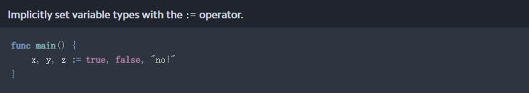 Go的一个非常酷的特性是 := 操作符。“short assignment”操作符可用于使用隐式类型一次设置多个变量。这意味着Go将根据分配的值自行解析每个变量的类型,而无需显式类型声明。下面的示例创建三个变量,其中x和y解析为布尔值,z解析为字符串: