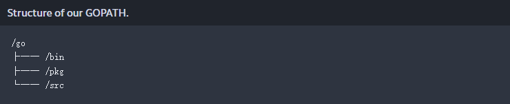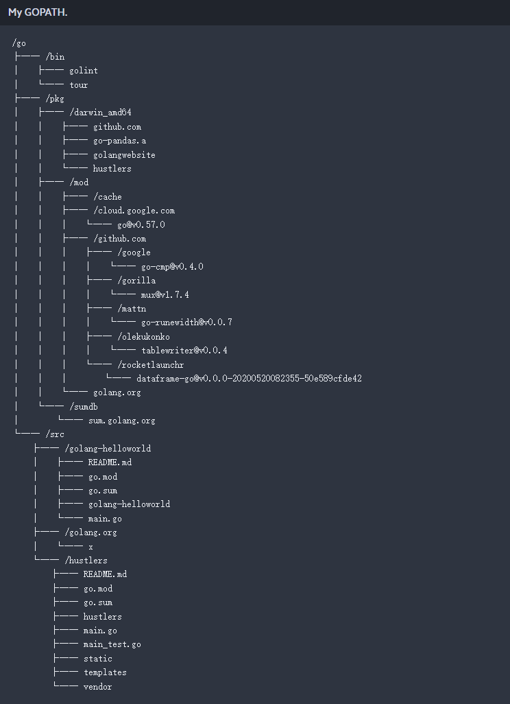 简而言之,您的个人源代码属于/src,安装的第三方软件包将位于/pkg中,扩展go-CLI的第三方命令将位于/bin中。举个例子,我的路径是这样的: