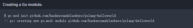 在新的项目目录中,我们现在将把项目初始化为Go模块。这意味着任何人都可以在Github上安装我们的Go代码,如果他们愿意的话。我知道我要将我的仓库保存到github.com/hackersandslackers/golang-helloworld,因此我们运行以下程序: