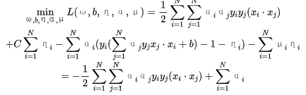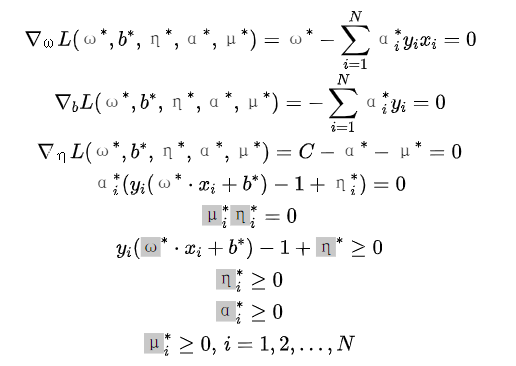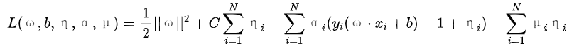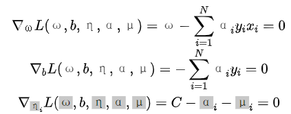 对偶问题是拉格朗日函数的极大极小问题。首先求L(ω,b,η,α,μ)对ω,b,η的极小(可参考学习笔记|拉格朗日对偶性),有