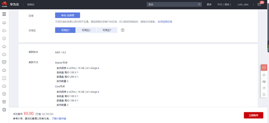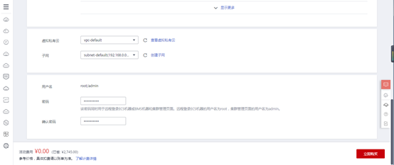 虚拟私有云:如果已有创建好的,选择即可。如果没有,点击“查看虚拟私有云”,进入虚拟私有云界面,点击“创建虚拟私有云”,所有参数默认,点击“立即创建”即可。回到购买集群页面,点击刷新按钮,即可选中创建的虚拟私有云。