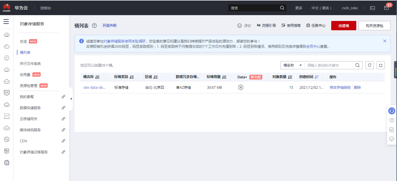 浏览器登录华为云,点击“控制台”->"服务列表" -> "存储" -> "对象存储服务",进入到对象存储服务页面,如下图所示:
