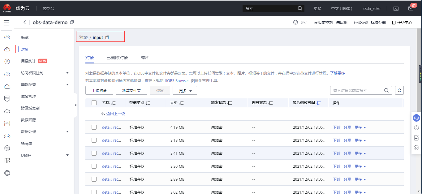 点击创建的“input”文件夹,然后点击“上传对象”,在弹出的对话框中选择解压后的数据文件(detail-records 文件夹中的所有文件)进行上传。结果如下图所示: