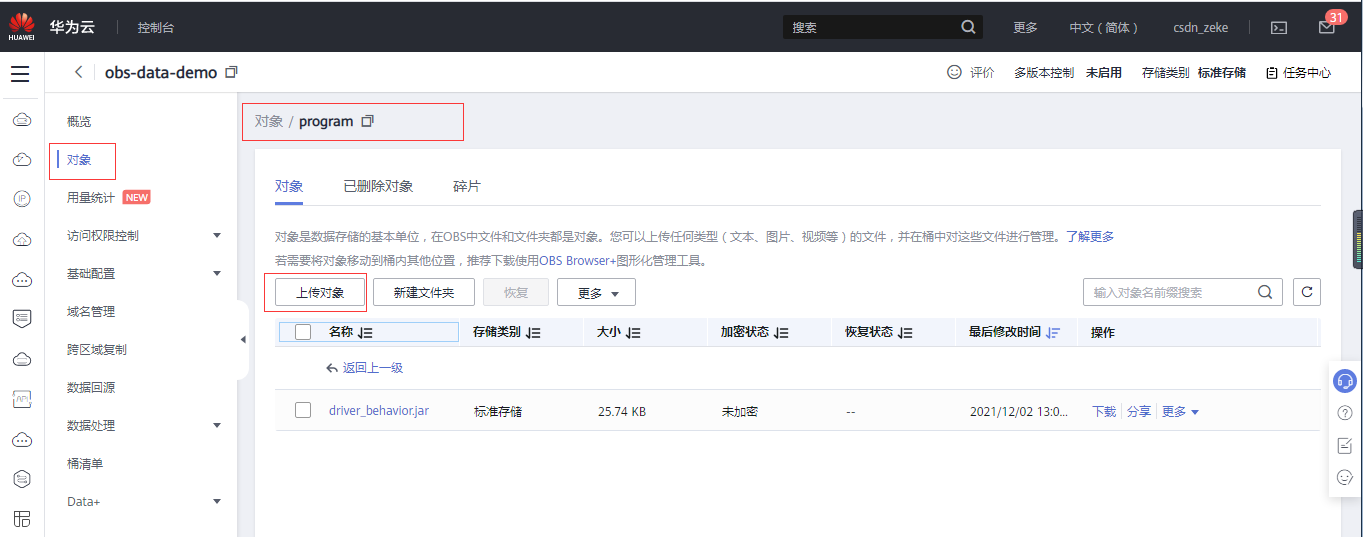 点击"对象”,在创建一个“program”文件夹,然后点击“上传对象”,在弹出的对话框中选择程序文件(driver-behavior.jar 文件)进行上传。结果如下图所示: