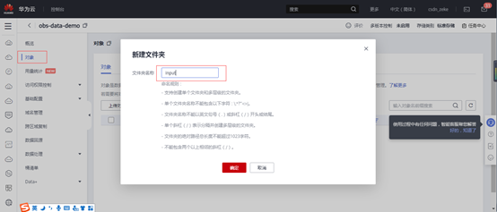 点击“立即创建”。创建完成后点击桶名称进入对象存储服务,点击左侧栏"对象",进入到对象管理页面,再点击“新建文件夹”创建一个名为“input”的文件夹,如下图所示: