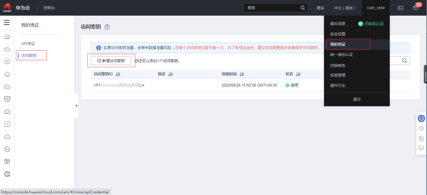 点击“控制台”,右上角账号名称 -> 我的凭证,点击左侧“访问秘钥”,点击新增访问秘钥,下载的文件里面就会有AK,SK。