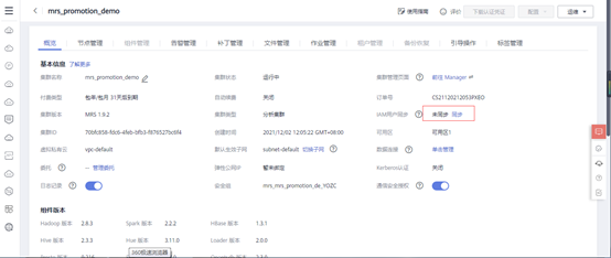 点击“控制台”->“服务列表”->“EI企业智能”->“MapReduce服务”进入MRS控制台,可以看到集群列表中创建的MRS集群,单击该集群名称进入,点击“概览”->“IAM用户同步”,点击同步。