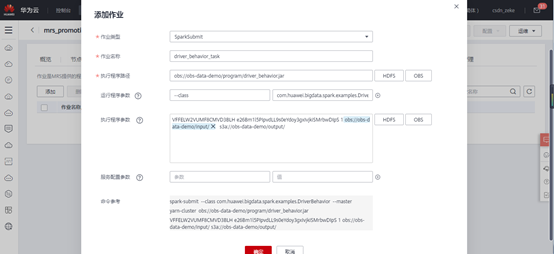 执行程序参数: AK SK 1 数据输入路径:点击“OBS”,选择创建的桶->“input”文件夹并确定;输出路径:直接输入 “s3a://桶名称/output/”;说明:其中AK和SK需要替换成之前下载文件中的Access Key Id和Secret Access Key。注意每个参数之间需要添加空格。