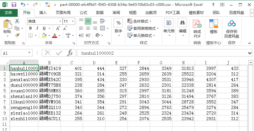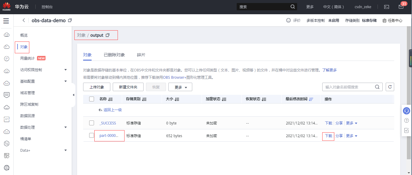 进入OBS(“控制台”->“服务列表”-> “存储” -> “对象存储服务”->“桶名称”->“对象”),可以看到生成“output”文件夹,点击打开,然后点击列表中以“part”开头的文件右侧的“下载”按钮将该文件下载到本地。