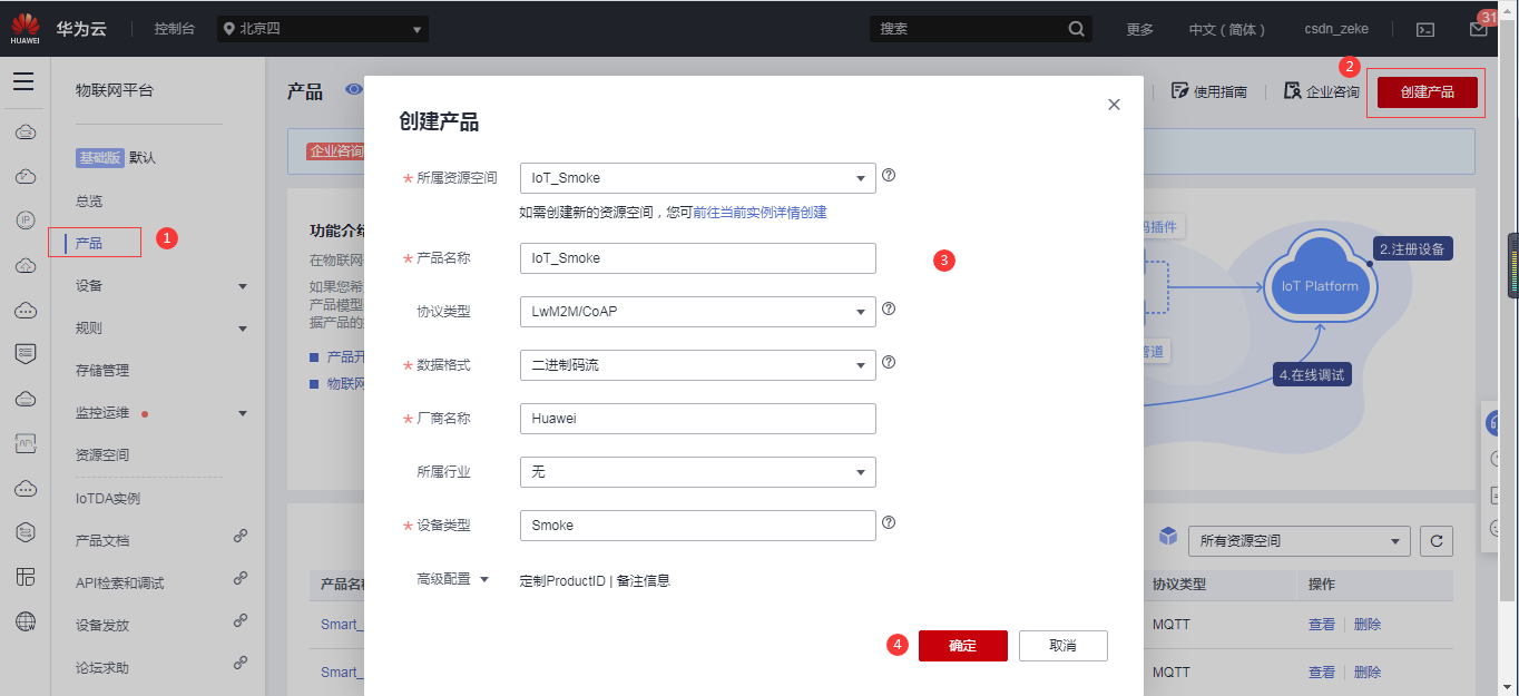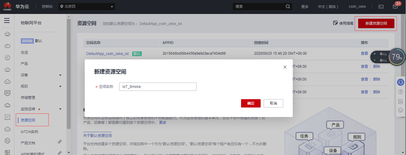 所属资源空间:选择上一步创建的资源空间“IoT_Smoke”