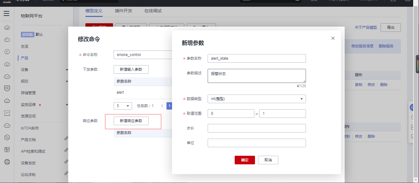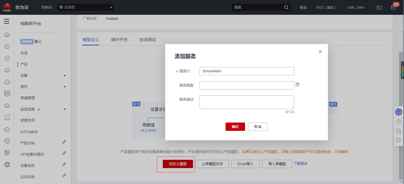 点击创建好的产品名称“IoT_Smoke”,进入产品详情,点击“自定义模型”,输入以下信息: