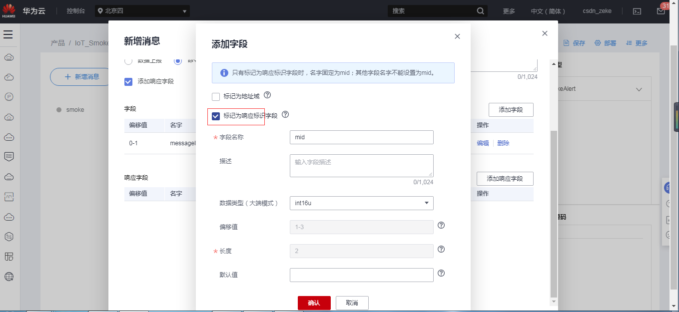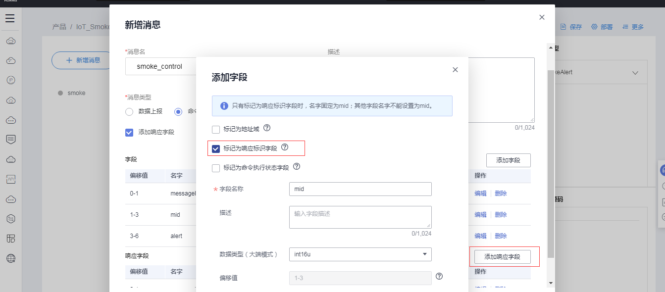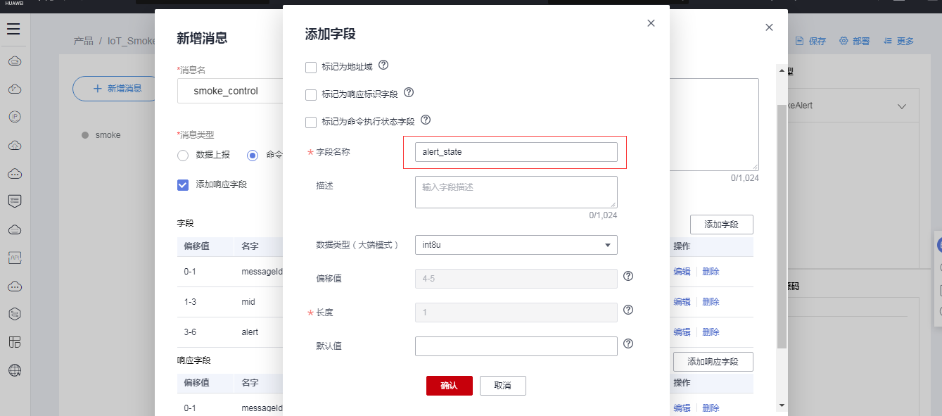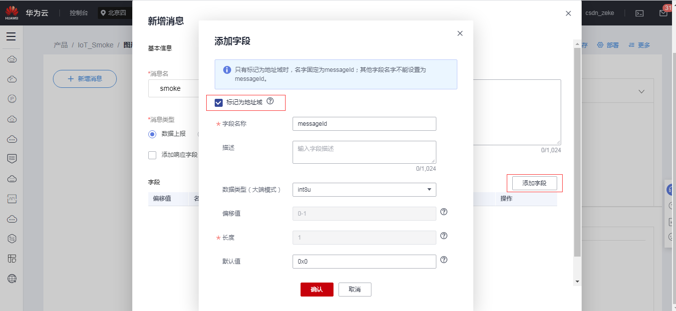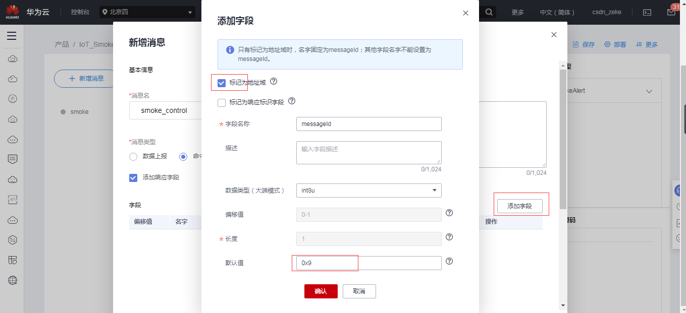 在“新增消息”页面,单击“添加响应字段”,勾选“标记为地址域”,字段名称默认 messageId,默认值填 0xa,然后单击“确认”。