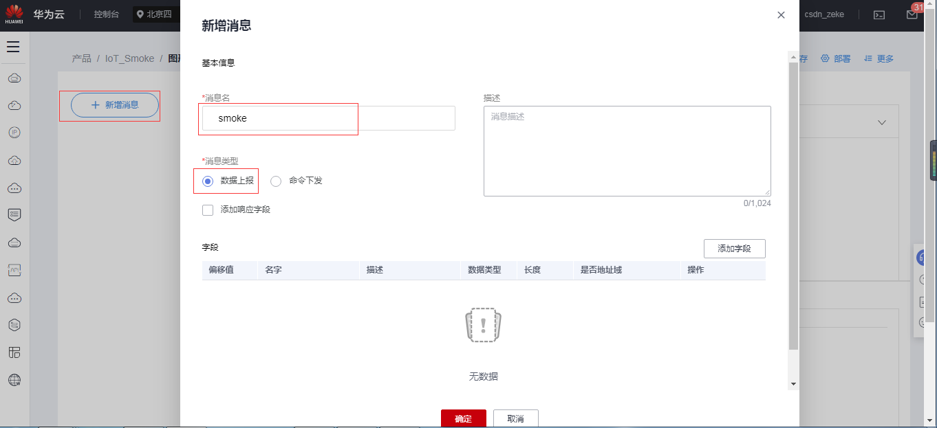 点击确认,字段添加完成,在点击确认,消息添加完成。
