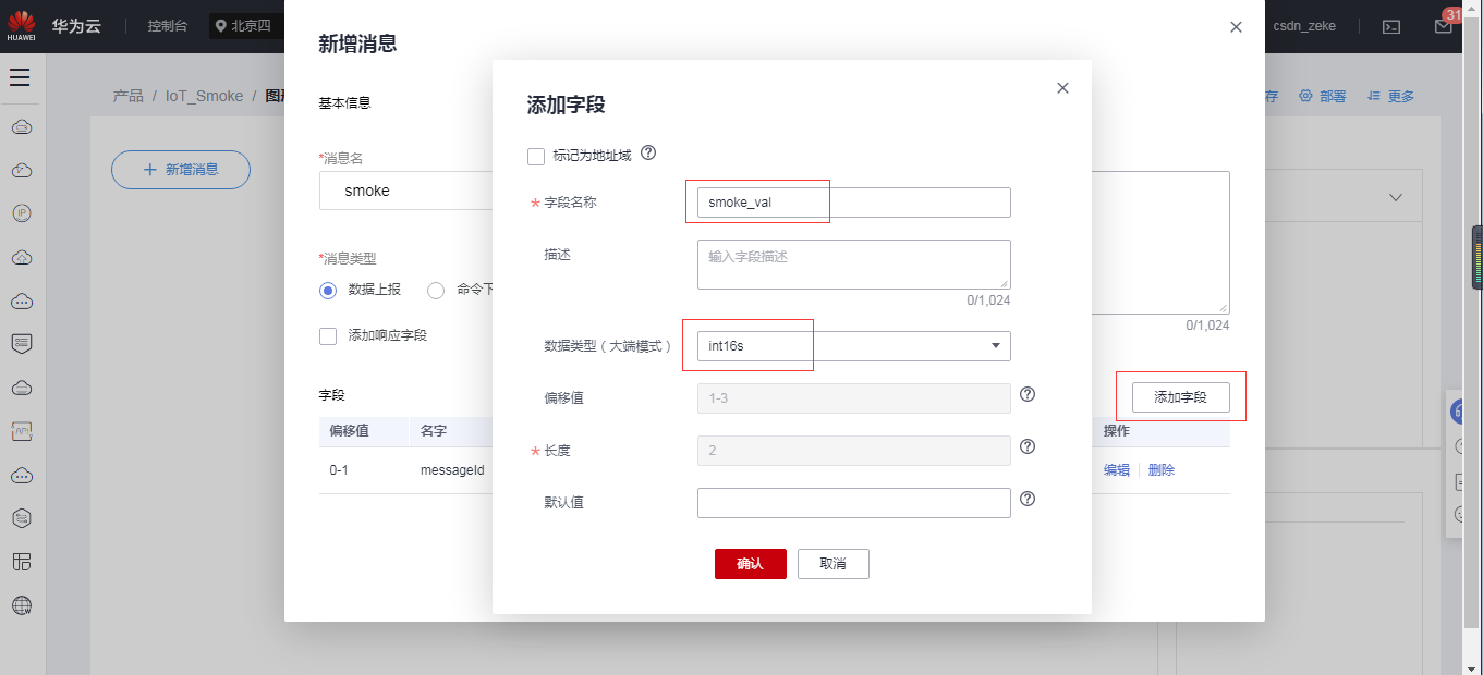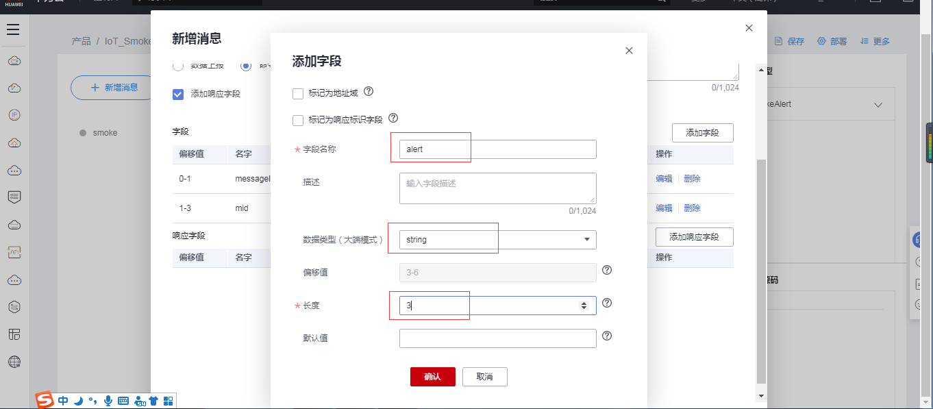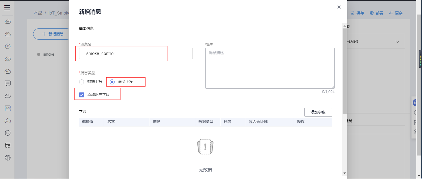 单击右侧“添加字段”,添加 smoke_val 字段,填写以下信息:
