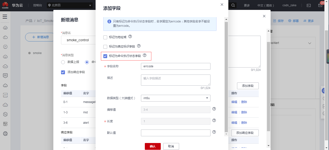单击“添加响应字段”,勾选“标记为命令执行状态字段”,字段名称默认 errcode,然后单击“确认”