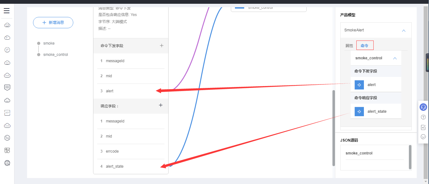 右侧“产品模型”区域,拖动属性字段、命令字段(下发和响应),与数据上报消息、命令下发消息和命令响应消息的对应字段建立关系。