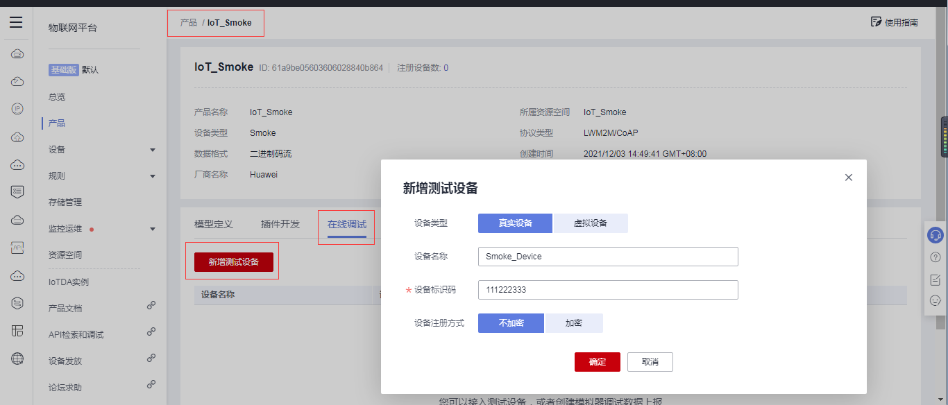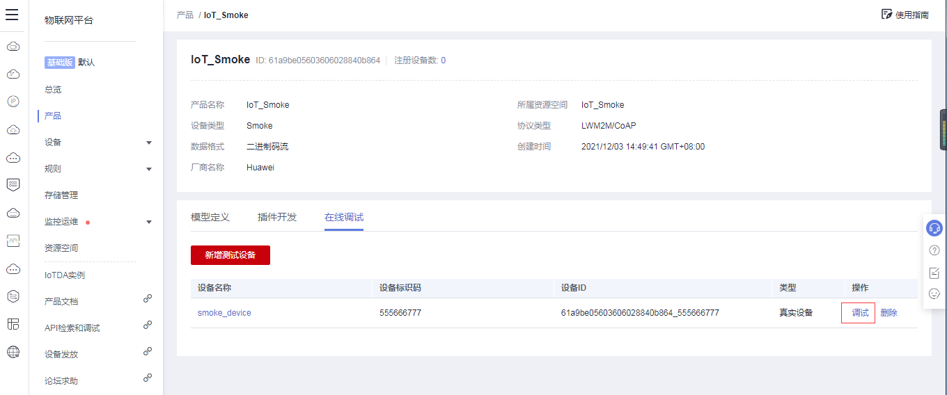 在产品详情页面,选择“在线调试”,单击“新增测试设备”,输入以下信息: