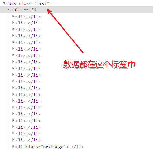 例如通过开发者工具查看网页,得到图片素材都在 <div class="list"> 和 <div class="page"> 这两个标签中,首先要做的就是拆解字符串,取出目标数据部分。