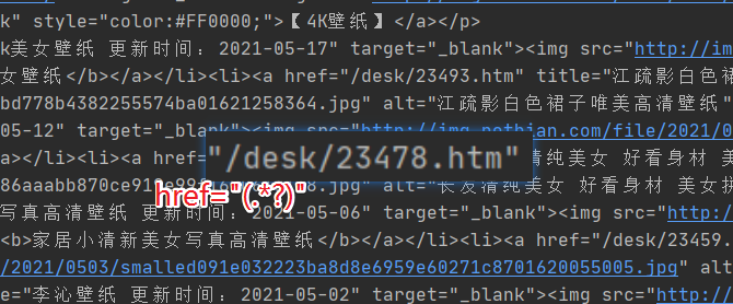 假设存在一个字符串:href="/desk/23478.htm",使用 href="(.*?)" 可以将其中的 /desk/23478.htm 匹配出来,括号的作用也是为了后续方便提取。